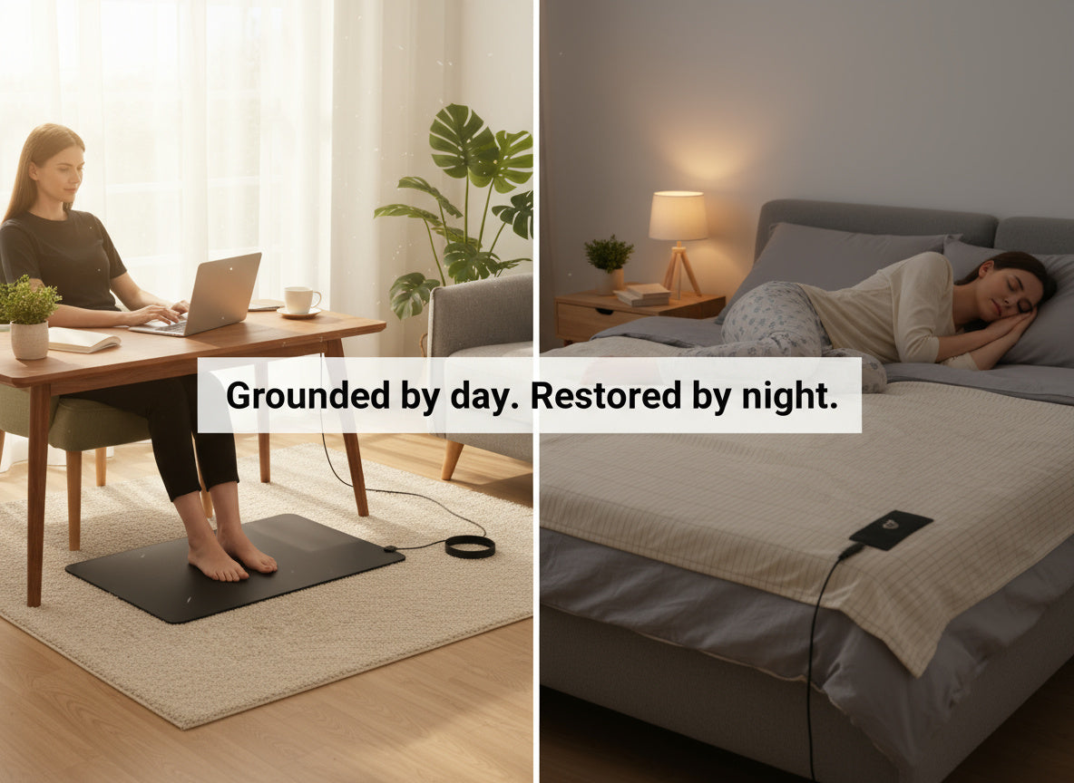 Most people only ground occasionally - we designed a system that supports you 24/7. The mat reconnects you during the day, the sheet restores you overnight. Together, they create a full-body reset that keeps you balanced and recharged around the clock.